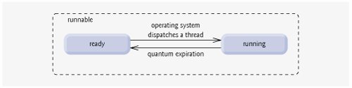 At the operating-system level, Java's runnable state actually encompasses two separate states (Fig. 23.2). The operating system hides these two states from the Java Virtual Machine (JVM), which only sees the runnable state. When a thread first transitions to the runnable state from the new state, the thread is in the ready state. A ready thread enters the running state (i.e., begins executing) when the operating system assigns the thread to a processoralso known as dispatching the thread. In most operating systems, each thread is given a small amount of processor timecalled a quantum or timeslicewith which to perform its task. When the thread's quantum expires, the thread returns to the ready state and the operating system assigns another thread to the processor (see Section 23.3). Transitions between these states are handled solely by the operating system. The JVM does not "see" these two statesit simply views a thread as being in the runnable state and leaves it up to the operating system to transition threads between the ready and running states. The process that an operating system uses to decide which thread to dispatch is known as thread scheduling and is dependent on thread priorities (discussed in the next section).