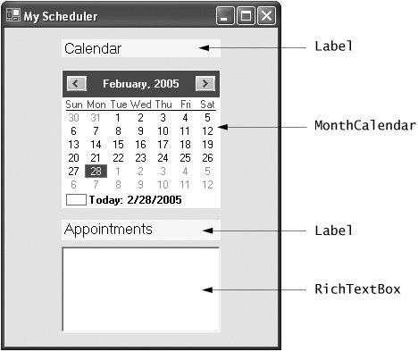 - Adding a MonthCalendar control to the Form. Add this control to the Form and center it horizontally in the appropriate place between the two Labels.