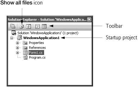 The solution's startup project is the project that runs when the program executes. If you have multiple projects in a given solution, you can specify the startup project by right-clicking the project name in the Solution Explorer window, then selecting Set as StartUp Project. For a single-project solution, the startup project is the only project (in this case, WindowsApplication1) and the project name appears in bold text in the Solution Explorer window. All of the programs discussed in this text are single-project solutions. For programmers using Visual Studio for the first time, the Solution Explorer window lists only the Properties, References, Form1.cs and Program.cs files (Fig. 2.17). The Solution Explorer window includes a toolbar that contains several icons.