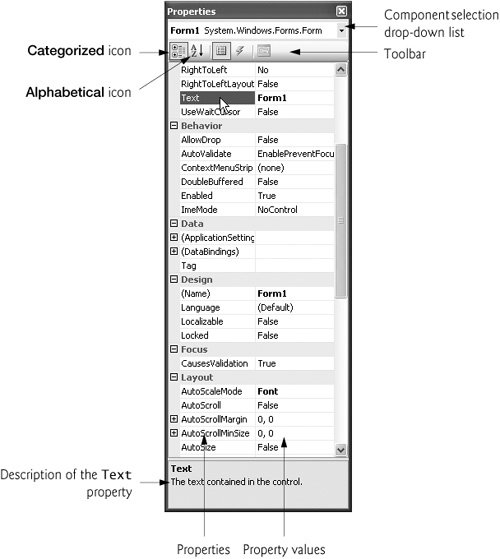 Figure 2.22 shows the form's Properties window. The left column lists the Form's properties; the right column displays the current value of each property. Icons on the toolbar sort the properties either alphabetically by clicking the Alphabetical icon or categorically by clicking the Categorized icon. You can sort the properties alphabetically in ascending or descending orderclicking the Alphabetical icon repeatedly toggles between sorting the properties from AZ and ZA. Sorting by category groups the properties according to their use (i.e., Appearance, Behavior, Design). Depending on the size of the Properties window, some of the properties may be hidden from view on the screen, in which case, users can scroll through the list of properties. We show how to set individual properties later in this chapter.