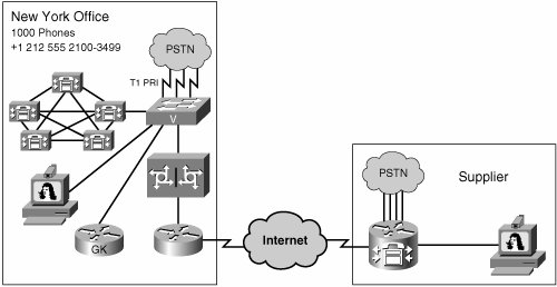 The New York office needs to connect a CallManager H.225 trunk to a SIP service provider. The CallManager is version 4.1.3. To provide security and protocol interworking, you plan to implement an IPIPGW to connect with the service provider, as shown in Figure 18-6.