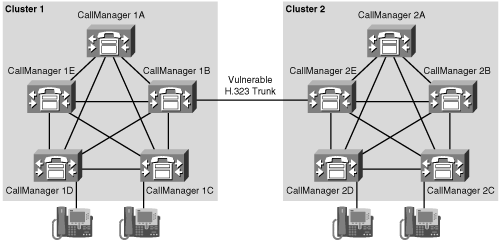 Like with physical IP devices, the CallManager list for H.323 trunks relates to redundancy. If, when you created an H.323 trunk, you created it only a single CallManager and statically associated it with either a gateway or a single CallManager in another cluster, calls between endpoints in your enterprise connected via the H.323 trunk will fail if a particular CallManager crashes. For example, in Figure 4-14, if either CallManager 1B or 2E fails, IP phones in cluster 1 cannot call IP phones in cluster 2.