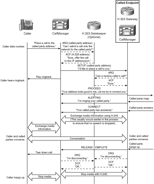 After all media information has been exchanged, the two parties can converse. When one hangs upin this case, the called partythe receiving gateway receives disconnection information, and issues an H.225 RELEASE COMPLETE message to CallManager. If the receiving endpoint and CallManager are gatekeeper-controlled, they issue DRQ messages to the gatekeeper to notify it of call termination.