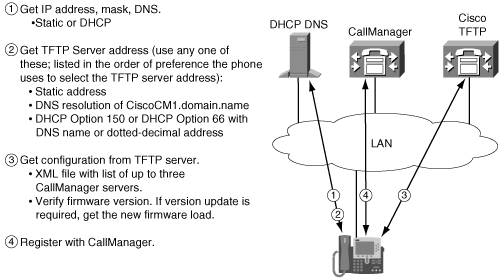 The phone can use Domain Name Server (DNS) or Dynamic Host Configuration Protocol (DHCP) and Trivial File Transfer Protocol (TFTP) to determine initially the IP address of the prioritized list of CallManager nodes to which the phone can register. Although each of these services can ease implementation, they are not all required.