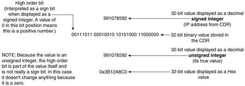 Figure 7-4 shows the steps needed to convert a 32-bit number into an IP address. As illustrated, the IP address from a CDR can be either a positive integer or a negative integer. When you look at it as a 32-bit binary value, it has four octets.