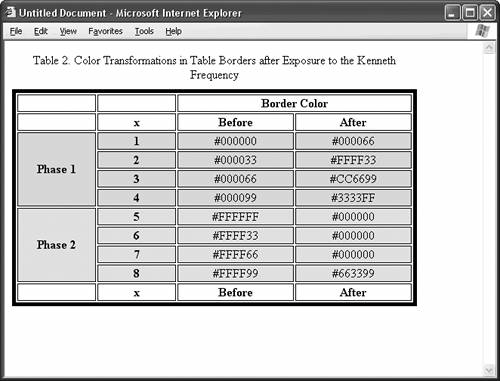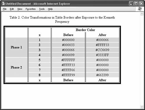 Figure 56.6 shows a table with these properties. The border around the outside of the table appears at a thickness of 5 pixels. The interior borders or rules retain their normal thickness but borrow the table border's color. Figure 56.6. This table has a five-pixel, black (#000000) border.  You can change the way the browser draws rules in the table by setting the table's rules attribute, like this: <table border="5" bordercolor="#000000" rules="cols"> By setting the rules attribute to cols, the browser draws rules around the columns only, as you can see in Figure 56.7. Table 56.2 summarizes the possible values of the rules attribute. Figure 56.7. Set the rules attribute of the table tag to determine how the browser draws rules. Here, the value of the rules attribute is cols.  Table 56.2. Values of the Rules AttributeVALUE | DRAWS RULES AROUND |