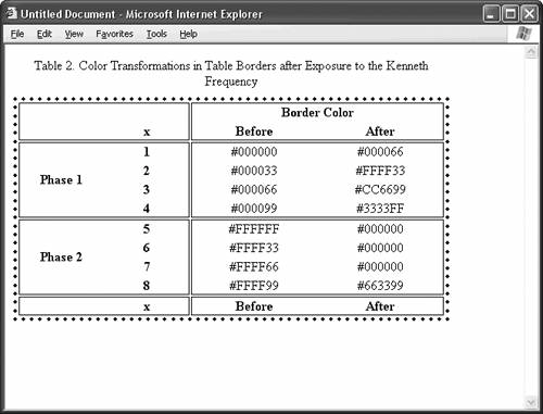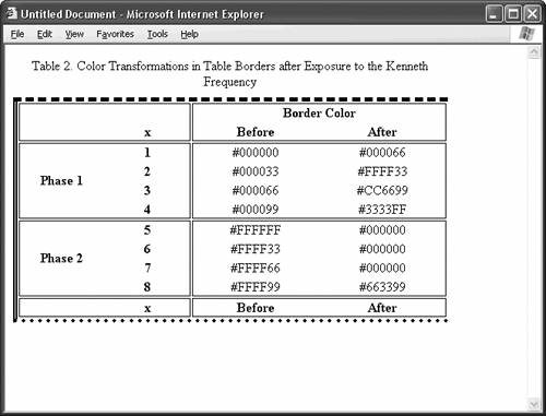 [*] CSS defines many other border styles, but not all browsers support them. You can set the borders of different sides of the table to different values, as in Figure 56.9: [View full width] <table border="5" bordercolor="#000000" rules="groups" style="border-top-style: dashed; border-bottom-style: dotted; border-left-style: double; border-right-style: none;">