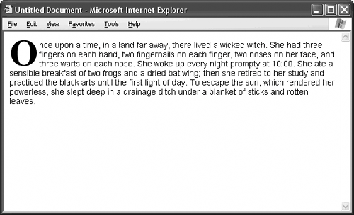 | TOOL KITStyle Sheet for Drop Caps In the publishing game, a drop cap is an oversized capital letter that usually appears at the beginning of a chapter. It's different from the example in Figure 57.2, though, in one notable way: It hangs below the baseline of the text, and the first three or so lines of type in the paragraph wrap around it, as in Figure 57.3. Figure 57.3. A drop cap is an oversized capital letter that hangs below the baseline of the text. The next couple of lines of type wrap around it.