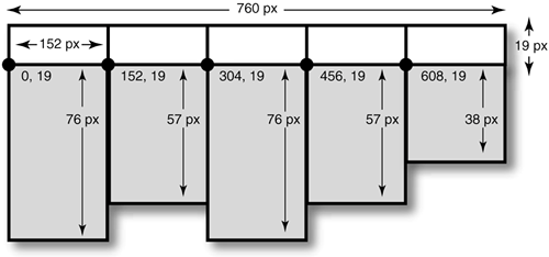 Now for the layers. You know how wide each layer has to be: 152 pixels, just like the width of each table cell in the nav bar. You need to calculate the height of each layer, which depends on how many navigation choices you want it to have. Obviously, this number can vary from menu to menu. Since the nav bar is 19 pixels tall, make it easy on yourself and take 19 pixels as your default height per menu choice. A menu with three choices only needs to be 57 pixels tall (19 times 3), while a menu with seven choices needs to be 19 times 7, or 133 pixels tall. To line up the layers with the table cells, you express the location of each layer in offsets from the top and left sides of the browser window. Therefore, if your nav bar is 19 pixels tall, you want to position your layers vertically at 19 pixels from the top of the screen. Horizontally, you start at 0 (no offset from the left), and you position each new layer in increments of 152, as Figure 10.6 shows. Figure 10.6. Position the layers in offsets from the top and left sides of the browser window.