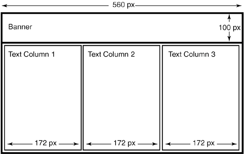 | Just as you used a nested table to create a multicolumn layout for table-based designs in Topic 20, you use nested div elements to create a multi-column layout in CSS. Drop the nested divs into the main content div of your layout, as in Figure 21.1, and you're golden. The only catch is, your main content div has to be fixed-width. It can't be liquid, or certain browsers choke when you apply the technique given here. Listing 21.1. View Source for Figure 21.1. <div style="position: relative; width: 560px; height: 100px;"> Banner </div> <div style="position: relative; width: 560px;"> <!-- Nested divs start here --> <div style="position: absolute; width: 172px; left: 0px;"> Text Column 1 </div> <div style="position: absolute; width: 172px; left: 186px;"> Text Column 2 </div> <div style="position: absolute; width: 172px; left: 372px;"> Text Column 3 </div> <!--Nested divs end --> </div> Figure 21.1. The main content div of this layout has a nested div for each of the columns of text.