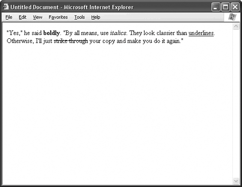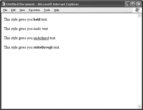 Listing 43.1. View Source for Figure 43.2. <p>This style gives you <span >bold</span> text.</p> <p>This style gives you <span >italic</span> text.</p> <p>This style gives you <span >underlined</span> text.</p> <p>This style gives you <span >strikethrough</span> text.</p> Figure 43.2. Instead of formatting tags, use CSS style definitions. They work just as well, and free up HTML to be a purely structural language once again.  TIP The abbreviated names of the style classesb, i, u, and scome from the names of the corresponding formatting tags as a way to trick old-school Web designers into using CSS. If you'd prefer more descriptive names, say like bold or ital, feel free to give these in the style definitions. Make sure the class attributes of your span tags reflect your revised class names. |