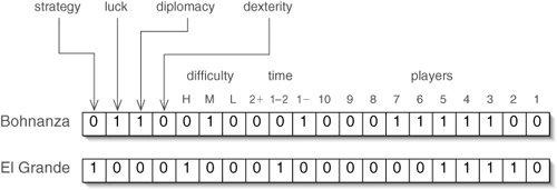 Figure 12-2. In a bit vector, each bit represents a single feature of the game. For example, El Grande can take 2, 3, 4, or 5, players, plays in 12 hours, is of high difficulty, and involves strategy.