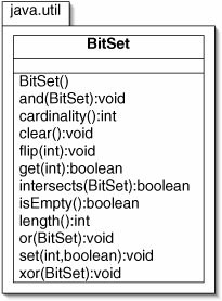 If we want to keep track of a set with more than 32 potential elements, we can use the BitSet class in the java.util package (Figure 12-10). A BitSet represents a long bit vector as a series of binary numbers. It performs arithmetic (similar to that we'll do in Section 12.3) to find the right bit in the right number. Like an ArrayList, a BitSet can also grow as necessary. Of course, since BitSet is an encapsulated class, we don't have to think about the details; we can simply treat it as an arbitrarily long bit vector.