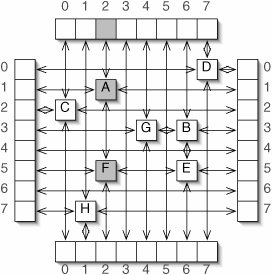 The solution to this problem is sketched in Figure 12-14. If we want to, for example, traverse column 2, we go to position 2 in the column header array across the top, then follow the chain of references down to the column footer array at the bottom. This visits only the exceptional elements in this column.
