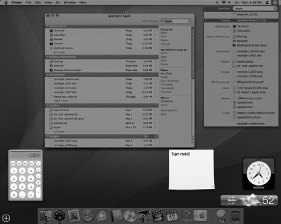 Figure 1-8. The Tiger desktop showing Dashboard and Spotlight  While it would be impractical to describe all of the benefits that Tiger brings to the table, here are some of the more noteworthy technologies Apple has introduced: