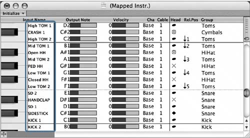 | 5. | Look at the three columns to the right in the mapped instrument window: Head, Rel.Pos (for Relative Position), and Group.