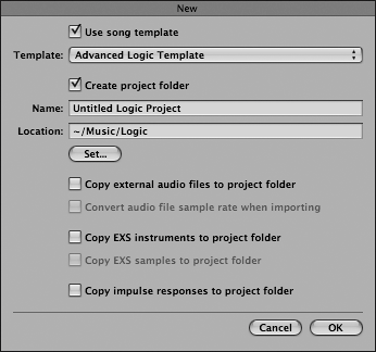 | Logic Pro organizes sessions by grouping related files within a project folder. At its most basic, a project folder contains two items: Often it also contains some or all of the following elements (depending on the song data, instrument choices, and plug-in choices): A Sampler Instruments folder, containing the sampler instruments used in the song A Samples folder, containing the audio files that are referenced by the sampler instruments used in the song An Impulse Responses folder, containing the impulse response files used by the song's instantiations of the Space Designer plug-in (convolution reverb) Creating a Project Folder When dealing with multiple dependent files, it is absolutely necessary to keep everything in the right place for Logic's retrieval. Not to worry, however, as Logic automatically generates appropriate folders in their correct locations when creating a new song. This helps to keep your sessions organized from start to finish. NOTE If you didn't complete Lesson 1 and Lesson 2, a version of the template used in this lesson is included with the Lesson 3 files in the following folder: Advanced Logic 7_Song Files/Lesson 03 Project Files/Advanced Logic Template. In order to do the exercises in this lesson, you must copy the file to the following location on your hard drive: ~/Library/Application Support/Logic/Song Templates. 1. | Choose File > New.