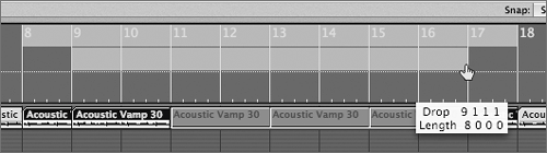 NOTE Remember which keys trigger the sounds you picked, as you will be recording them one at a time, for each pass of the cycle. Be prepared, as this section will repeat itself without a pause between takes. Now it is time to record the parts. In order to have a little lead time between takes, let's create a slightly smaller Autodrop region within the cycle Region, giving you a bar on each side. Logic will record only within the boundaries of the autodrop region.