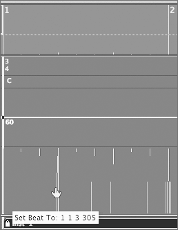 | 2. | Zoom out horizontally until you can see about four bars in the Arrange window. This enables you to see greater detail when working in the Beat Mapping track.