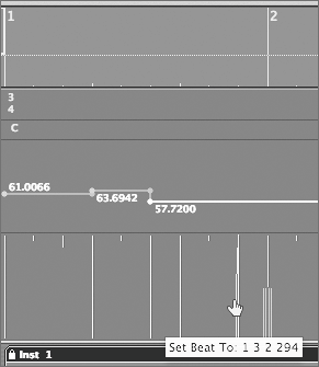 NOTE Logic uses very fine tempo increments (as small as 1/10,000 of a beat!) for accurate alignment. | 4. | Using the same technique, connect the line representing measure 1, beat 2, third division (1 2 3 1) to the light blue line located below and slightly to the left (1 2 2 294).