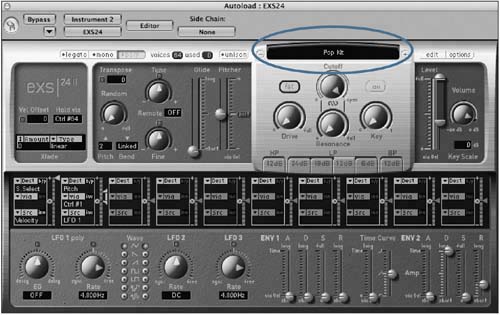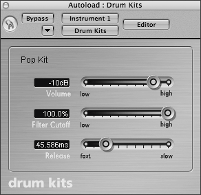 | 7. | Click-hold in the sampler instrument window (directly above the Filter section's Cutoff knob), and choose 08 Drum Kits > Pop Kit.