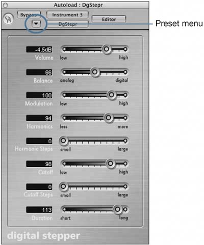 | 10. | Select the Inst 3 track, and adjust the Harmonic Steps slider within the Digital Stepper instrument until it reaches a value of about 75.