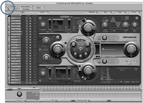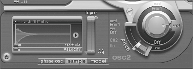 The crash sound within this kit is generated from an audio sample. Oscillator 2 can be configured for all three types of sound generation offered by Ultrabeat: phase oscillator, sample playback, and even component modeling.