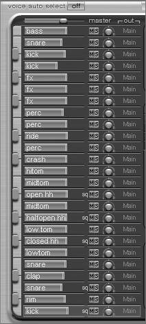 | Working with Voices The left side of Ultrabeat's interface contains the Voice section. Each voice carries its own sound and has independent parameters that can be adjusted for volume, solo, mute, pan control, and audio output.  1. | Click a few of the voice names (kick, snare, and so on).