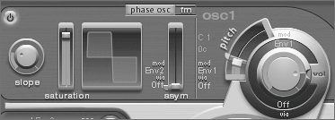 The oscillator is set to Phase Osc, which utilizes the Slope, Saturation, and Asymmetry controls to shape the waveform into almost any basic synthesizer waveform.
