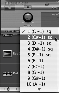 NOTE Each slot is assigned an associated note value (pitch and octave), that is displayed in parentheses. You will be using these MIDI note values to trigger sequence playback later in this lesson. | 4. | Click-hold the pattern # menu and choose "5 (E-1) sq."