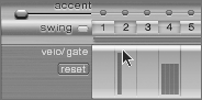 | NOTE Step width indicates length (Gate Time) of the notes in the trigger row. In this case, the sound being triggered has an extremely short release, so this parameter does not audibly affect the sound. Applying Swing to the Pattern The Swing knob, located to the left of the step grid (see step 3 in "Working with the Step Sequencer"), lets you adjust the feel of the pattern by increasing the distance between notes. Notes on odd-numbered steps remain unchanged, while even-numbered notes are slightly shifted. This control affects all voices that have swing enabled in the pattern (different swing amounts cannot be assigned to voices individually). 1. | While the sequencer is in play, click-hold the Swing knob, dragging the pointer up and down to adjust the value.