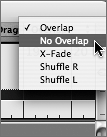 As the name suggests, No Overlap is used in situations where you don't want to create overlapped Regions. In this mode, placing a selected Region over another automatically trims the underlying Region and eliminates overlaps.