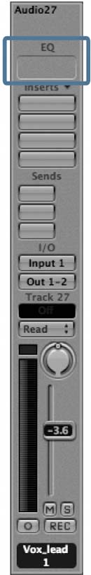 | Using the Channel EQ The Channel EQ is part of Logic's suite of equalizers and is the default equalizer for use in channels. This high-quality plug-in offers eight frequency bands, with an integrated FFT (Fast Fourier Transform) analyzer and an intuitive graphical interface. 1. | In the Vox_lead channel (Track 1) at the far left of the Track Mixer, double-click the EQ area.