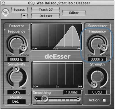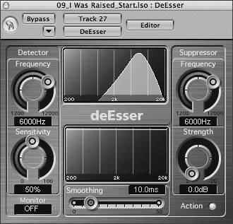 The DeEsser plug-in is a frequency-specific compressor, rejecting a specific frequency band for as long as a threshold level is exceeded. It accomplishes this by locating the problem frequency with the Detector and reducing the same frequency band (or a different band) with the Suppressor.