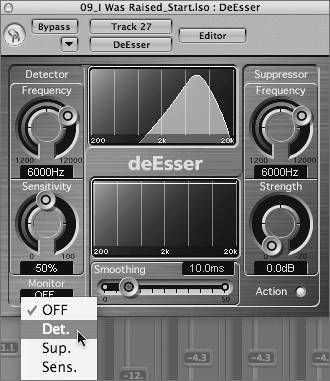 Logic's DeEsser has an extremely flexible monitoring system that allows you to listen to various functions of the DeEsser at work. This enables you to home in on the offending band quickly and easily.