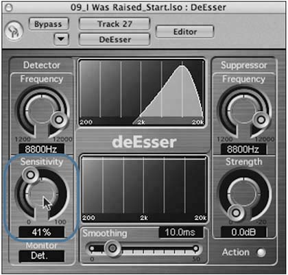 After isolating the frequency of the sibilance, you're ready to set the threshold at which gain reduction is applied. You can do this more effectively by monitoring the Sensitivity control, which dictates the threshold at which the DeEsser begins to work.