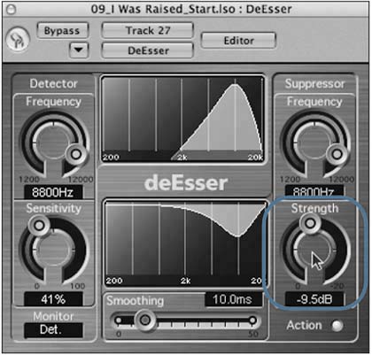 The sound changes because you're monitoring through the entire DeEsser audio chain. Now that you have successfully isolated the offending frequency, you're ready to apply gain reduction by using the Strength control.