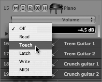 | 7. | Click the Automation Mode pop-up menu on the Kick channel, and choose Touch.