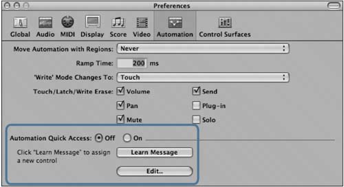 | Using Automation Quick Access In order to truly benefit from using real-time automation, you need to control the channel with something other than the mouse. Ideally, a hardware control surface that is designed to integrate with Logic's Track Mixer would provide the best control for real-time automation, but any MIDI controller will do. Automation Quick Access allows you to assign any knob, fader, or wheel on your MIDI controller to the currently visible automation parameter on a track. While this lets you use your MIDI hardware to write real-time automation, it is limited to automating only one parameter at a time. While a fader control (available on many MIDI keyboards) is more appropriate for controlling volume level, in this exercise you will be assigning the modulation wheel on your MIDI keyboard, as this is more widely available on MIDI hardware. 1. | Choose Logic Pro > Preferences > Automation.