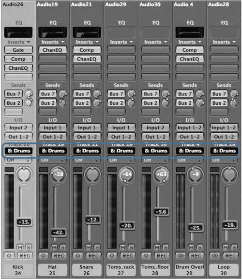 Note that the drum tracks have been assigned to Group 8, named Drums.