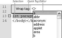 | To the left of the Code View window is the Coding toolbar (Figure 3.19), which provides quick access to several coding features. You can also access each of these items via other Dreamweaver menus, but the Coding toolbar offers you quick access in Code view. Figure 3.19. The buttons on the Coding toolbar.  To access the Coding Toolbar: Tip The Coding toolbar contains 15 buttons for rapid access to coding features: Open Documents lets you toggle between any open documents in the Dreamweaver workspace. Collapse Full Tag, Collapse Selection, and Expand All let you access Code Collapse features. For more details, see "Using Code Collapse," above. Select Parent Tag lets you quickly select a complete tag. Balance Braces helps you troubleshoot your code for balanced braces. When braces are balanced, every opening parenthesis ((), brace ({), or bracket ([) in your code has a matching closing parenthesis ()), brace (}), or bracket (]). See the task "To check for balanced braces," later in this chapter, for more details. Line Numbers displays line numbers to the left of your code. Highlight Invalid Code highlights invalid HTML in yellow. Apply Comment and Remove Comment add and remove comments. For more details, see "To make quick edits to a code selection," earlier in this chapter. Wrap Tag wraps a selection from your page with an HTML tag that you choose from the drop-down list in the Quick Tag Editor, which appears when you click the Wrap Tag button (Figure 3.21). The Quick Tag Editor is most often used in Design view to add or edit HTML tags without leaving Design view. In Code view, it's easier to use Code Hints or type the tag name than to use the Quick Tag Editor. For more information about the Quick Tag Editor, see Dreamweaver Help (F1). Figure 3.21. Click the Wrap Tag button to open the Quick Tag Editor and wrap a selection with tags chosen from the Quick Tag Editor list.  Recent Snippets inserts a recently used code snippet from the Snippets panel. For more details, see "Using Code Snippets," later in this chapter. Indent Code and Outdent Code let you indent and outdent code selections. For more details, see "To make quick edits to a code selection," earlier in this chapter. Format Source Code applies new formatting preferences to existing documents. For more details, see "Using Commands for Editing Code," later in this chapter. Verifying that your code is balanced Two coding features accessible on the Coding toolbar verify that your code is balanced. You can use Select Parent Tag to verify that all your tag sets (pairs of opening and closing tags) are complete, and you can use Balance Braces to verify that all of your parentheses, braces, and brackets occur in balanced pairs. Unbalanced tag sets and unbalanced braces are common sources of code errors. To select a parent tag: 1. | In Code view, place the insertion point within a line of code.