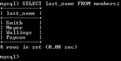 | 3. | At the prompt, type SELECT last_name FROM members; and press Enter (Windows) or Return (Mac).