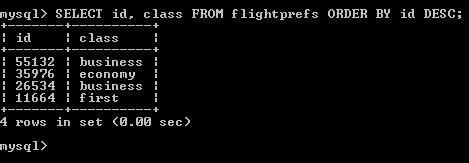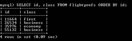 | 3. | At the prompt, type SELECT id, class FROM flightprefs ORDER BY id; and press Enter (Windows) or Return (Mac).