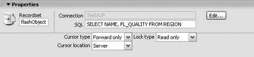 | Tip You can also edit a recordset in the Property inspector. On the Bindings panel, select the recordset. Open the Property inspector by choosing Window > Properties from the main menu. Click the Edit button (Figure 7.35). The Recordset dialog appears, where you can make changes. Figure 7.35. Click the Edit button in the Property inspector to open the Recordset dialog and make changes to the recordset.  To delete dynamic content: 1. | Open the page in Dreamweaver containing the dynamic content you wish to delete.