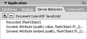 | 2. | In the Application panel group, click the Server Behaviors tab to access the Server Behaviors panel.