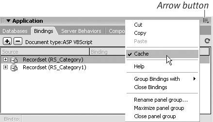 Figure 7.38. On the Bindings panel, click the arrow button in the top-right corner, and select Cache from the pop-up menu.  The recordset is saved in a Design Note associated with the file.