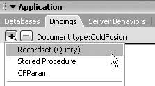 Figure 10.14. Choose Recordset (Query) from the Bindings panel menu to open the Recordset dialog and create a new recordset.  The Recordset dialog appears (Figure 10.15).