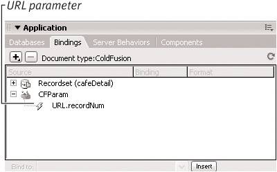 The URL parameter now appears on the Bindings panel (Figure 10.17). If you're using ASP or PHP, the URL parameter doesn't appear in the Bindings panel. Instead, in PHP, the URL parameter is listed in the Server Behaviors panel as a Dynamic Attribute. In ASP, the URL parameter is included in the Server Behaviors panel as Go to Detail Page.