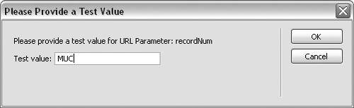 Figure 10.18. Enter a value for the recordNum URL Parameter in the Please Provide a Test Value dialog. The value should be the same as the CODE field value for the record you want to include, such as MUC, for the Munich record.  | 7. | Enter any value from the CODE fieldfor example, MUC, for the Munich airport. Click OK.