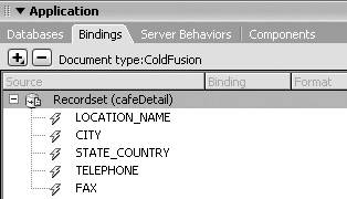 | 3. | Click the plus button to the left of Recordset (cafeDetail) to expand the recordset and display the field names (Figure 10.20).